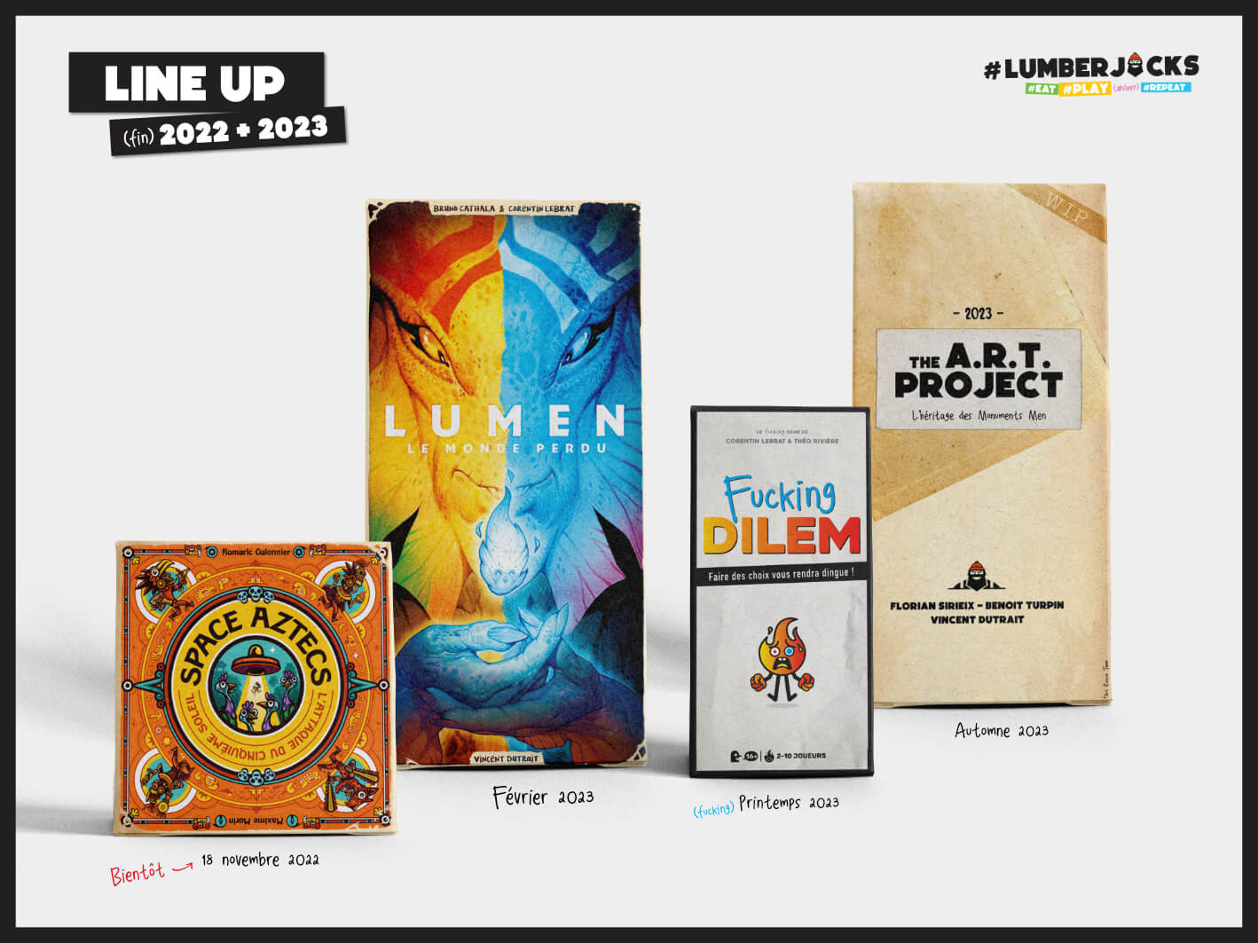 L’année 2022 a été assez « maigre » en nouveauté du côté des bûcherons mais 2022 a été riche en réflexion(s) et remise(s) en question(s). Depuis bientôt 7 ans que nous éditons des jeux, nous avons testé des choses par-ci, tenté des choses par-là, parfois avec succès, parfois sans mais diable que cela a été bon à chaque fois. Apprendre de nouvelles choses et repousser de nouvelles limites a été enrichissant… Nous avons eu besoin de nous ressourcer et de savoir où nous souhaitions aller ces prochaines années. Analyser nos erreurs et nos réussites TREK 12 et MAGIC RABBIT, entre autres, recommandés au Spiel DES JAHRES la même année nous a mit un coup de pied au c** comme jamais.